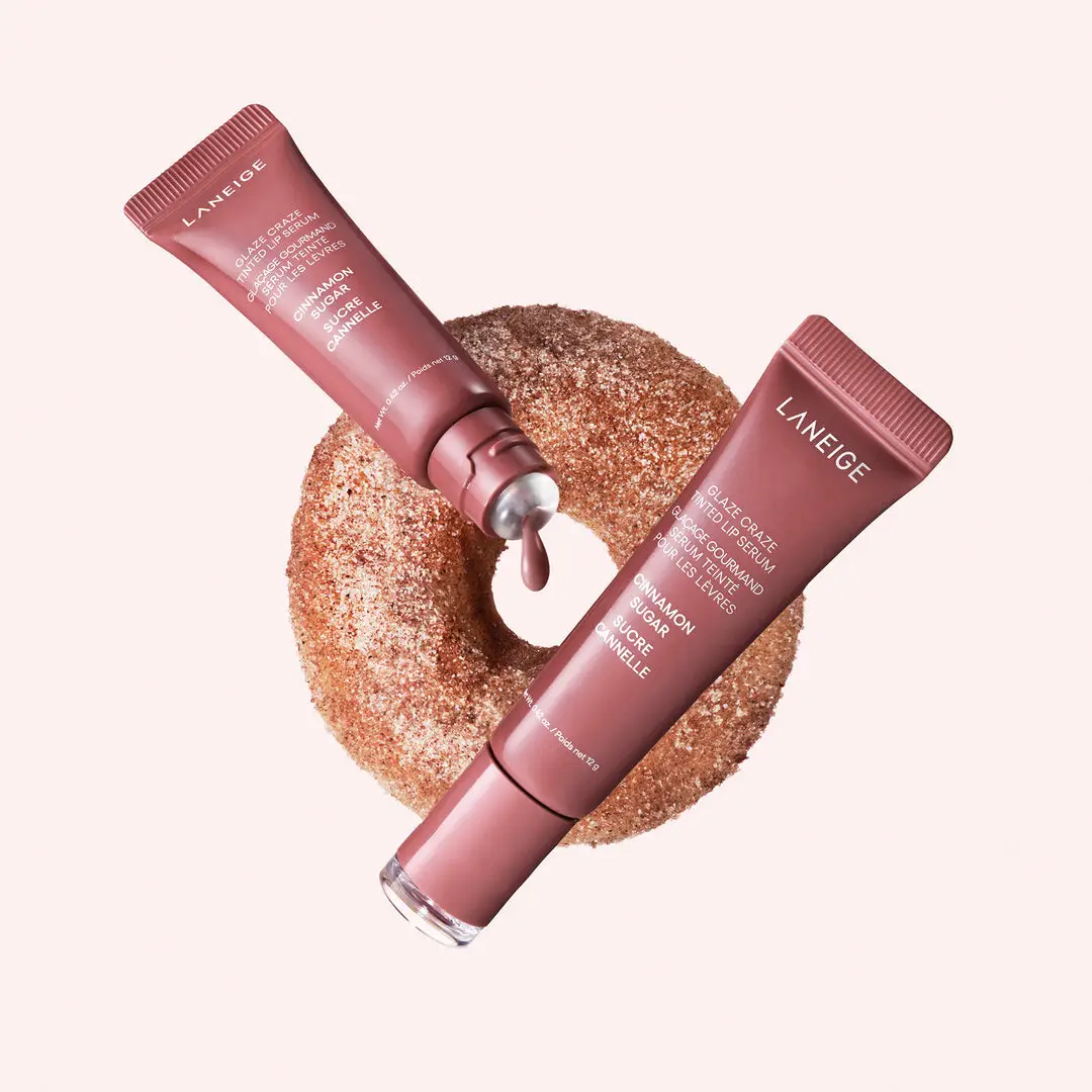 The LANEIGE Glaze Craze Tinted Lip Serum is a nourishing Korean skincare-infused lip product that provides a glossy, high-shine finish and visibly plumped lips. The specific shade shown is Cinnamon Sugar, a subtle mauve pink with a sweet scent.